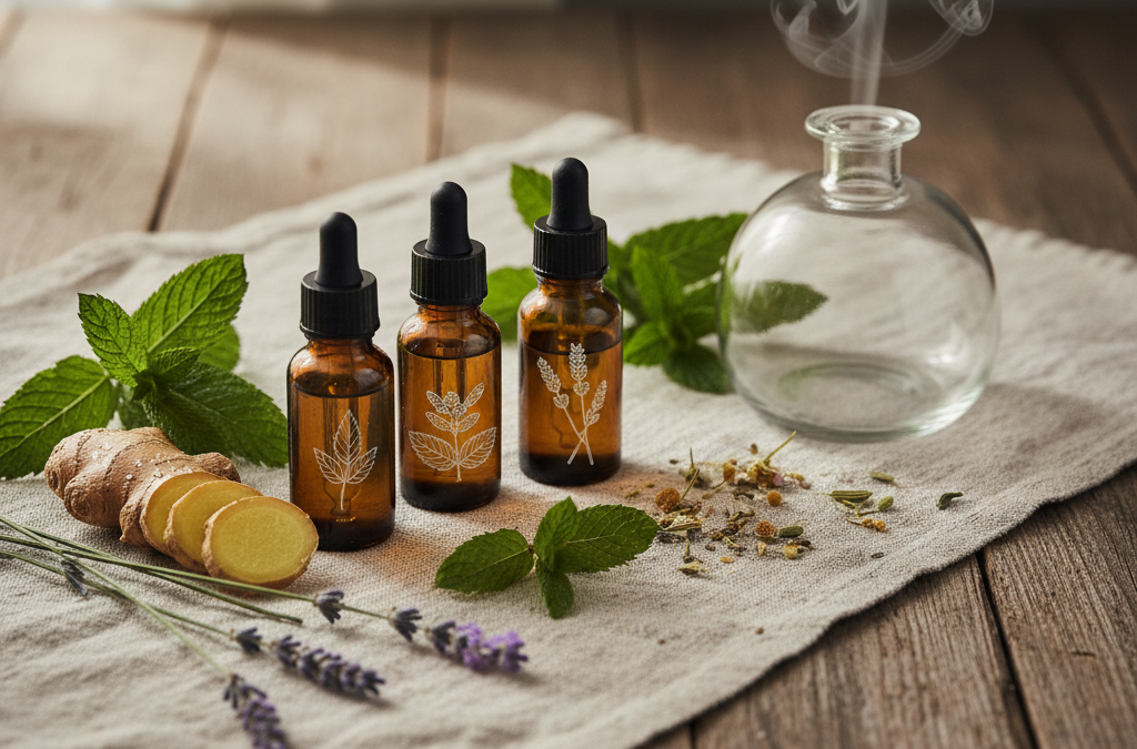 Aromaterapia wykorzystuje olejki eteryczne pochodzące z roślin i wykazuje obiecujące efekty w łagodzeniu objawów CIGT. Dotychczasowe przeglądy systematyczne skupiały się głównie na nudnościach i wymiotach, pomijając inne symptomy. Brakuje też jasnych danych na temat wpływu rodzajów olejków, form podania oraz czasu trwania terapii na skuteczność leczenia.
