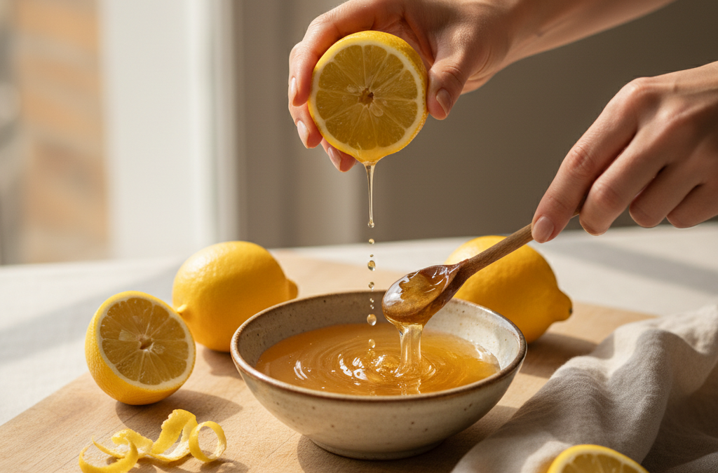 - Cytryna z miodem: Wymieszaj sok z cytryny z miodem i nałóż na wilgotne włosy.