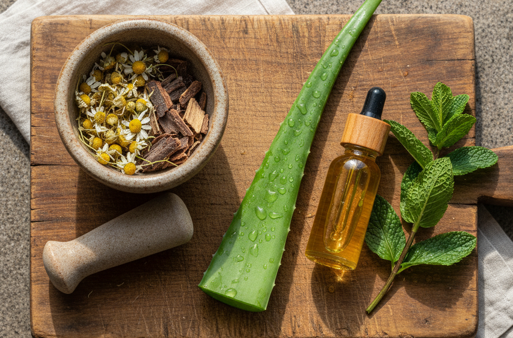 - Aloes: Nawilża skórę i przyspiesza gojenie ran.