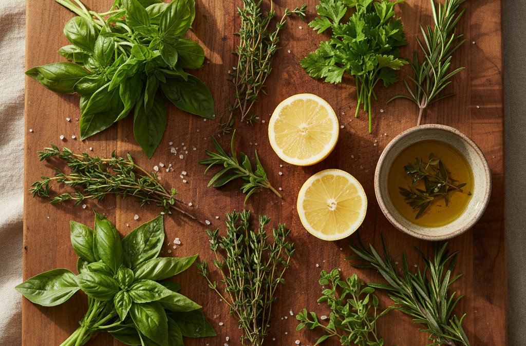 – Świeże zioła (np. tymianek, rozmaryn, oregano)