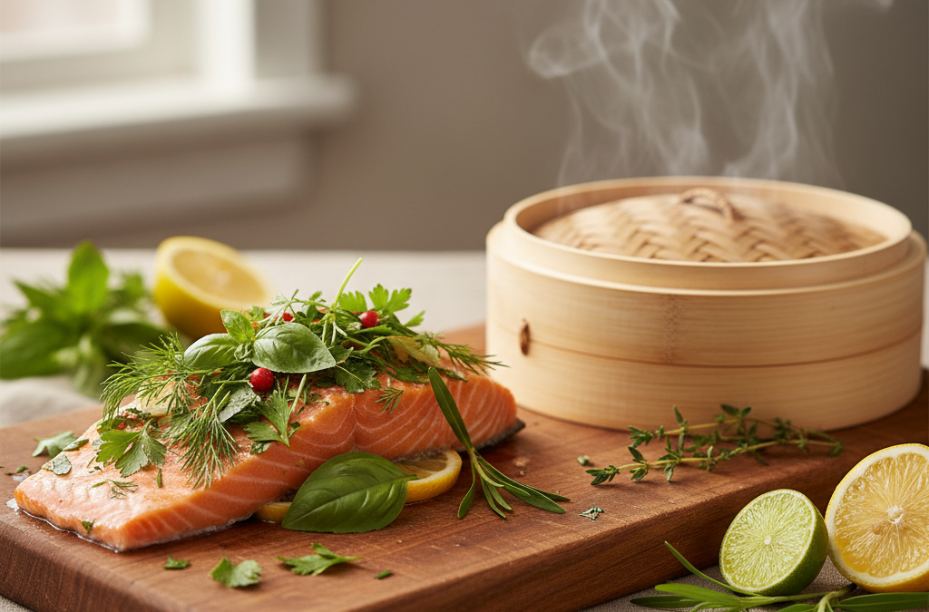 4. Umieść łososia: Połóż filet na sitku parownika. Posyp ziołami i opcjonalnie dodaj plasterki cytryny.
