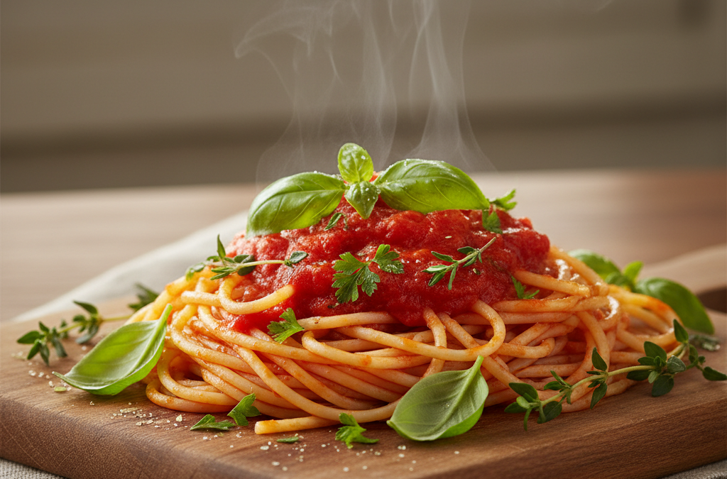 Makaron z sosem pomidorowym i bazylią