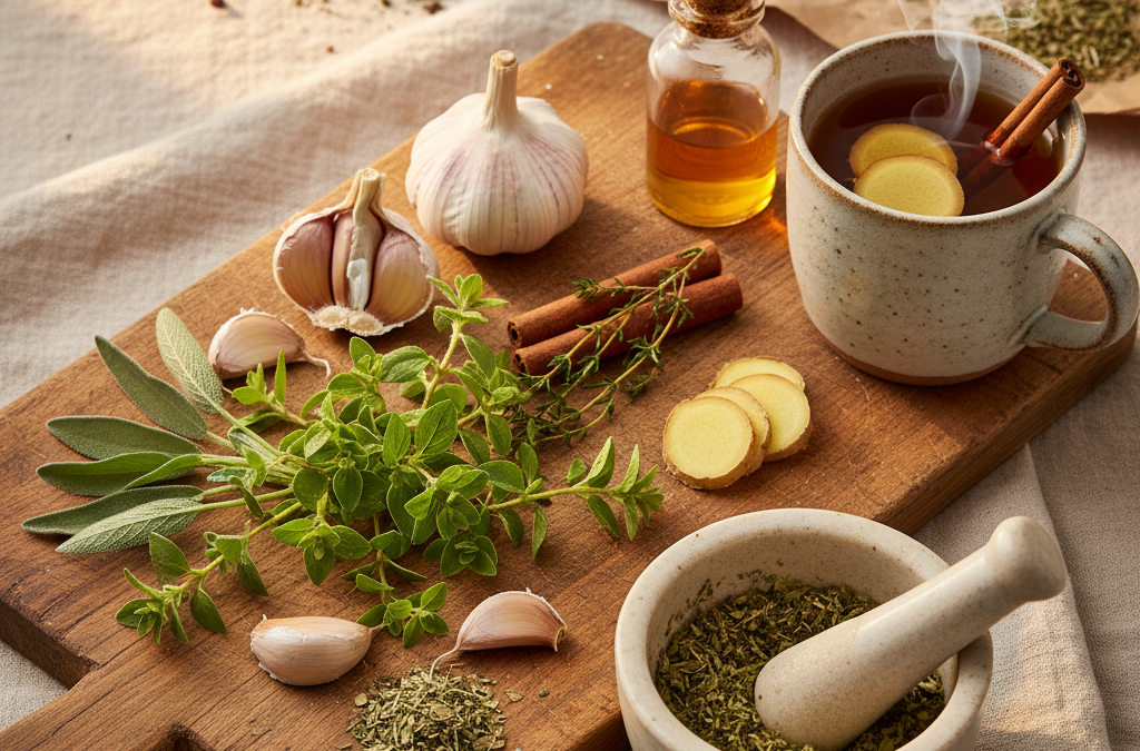 - Przyprawy – dodawanie ziół do potraw wspiera walkę z infekcjami.