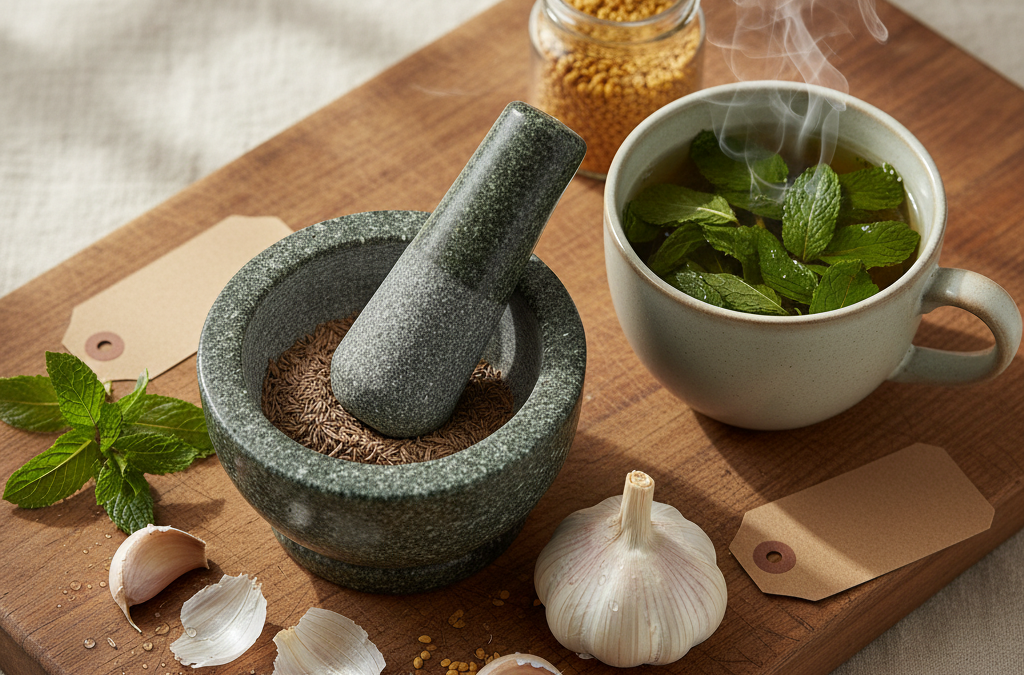 – Herbatki ziołowe: Można przygotować napary z czosnku, mięty lub kminku. Wystarczy zalać zioła wrzątkiem i parzyć przez kilka minut.