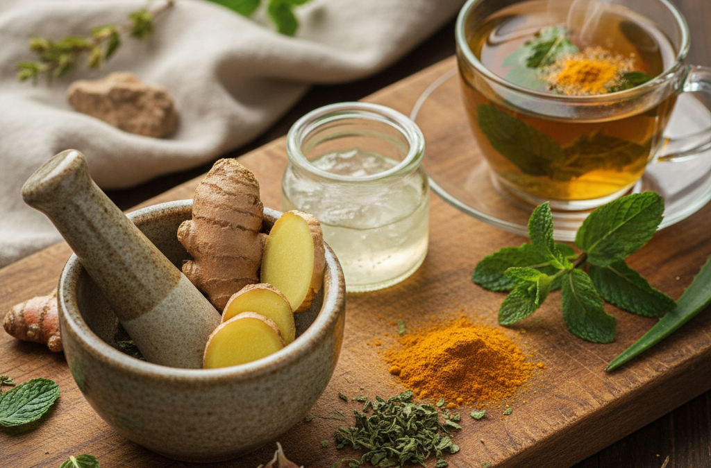 Imbir działa przeciwzapalnie i może pomóc w łagodzeniu objawów żołądkowych. Można go dodawać do potraw lub pić jako napar.