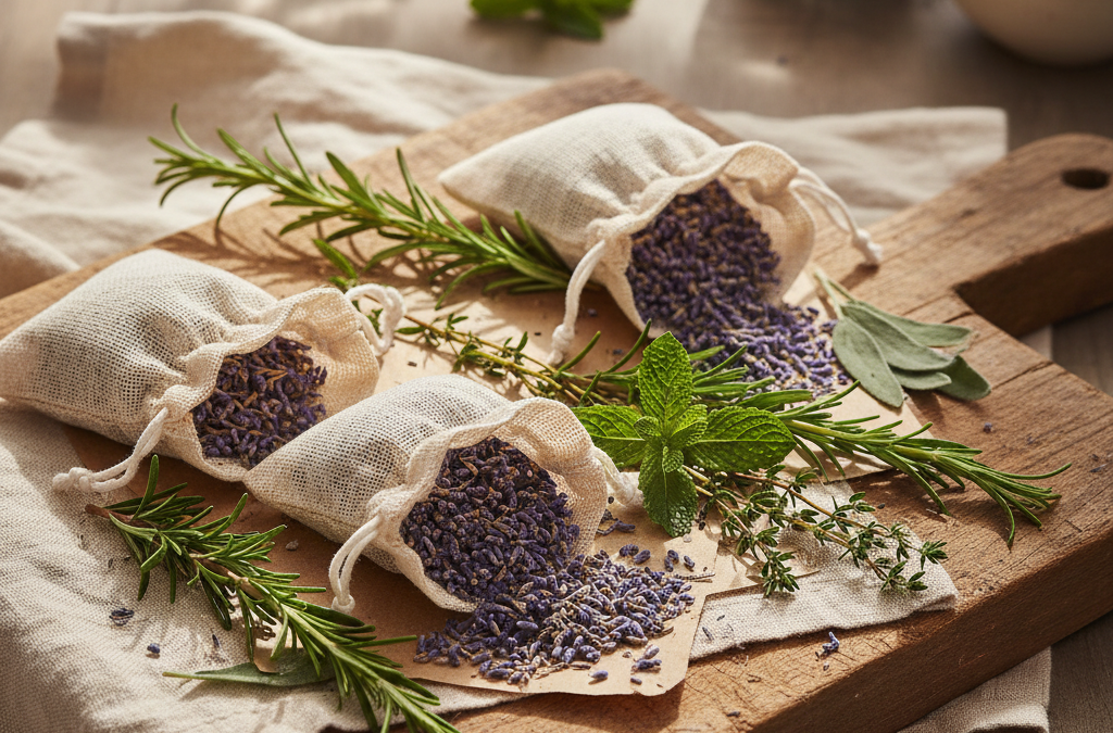 – Woreczki z ziołami: Można uszyć małe woreczki z materiału i napełnić je suszonymi ziołami. Umieść je w szafkach, gdzie przechowujesz żywność.