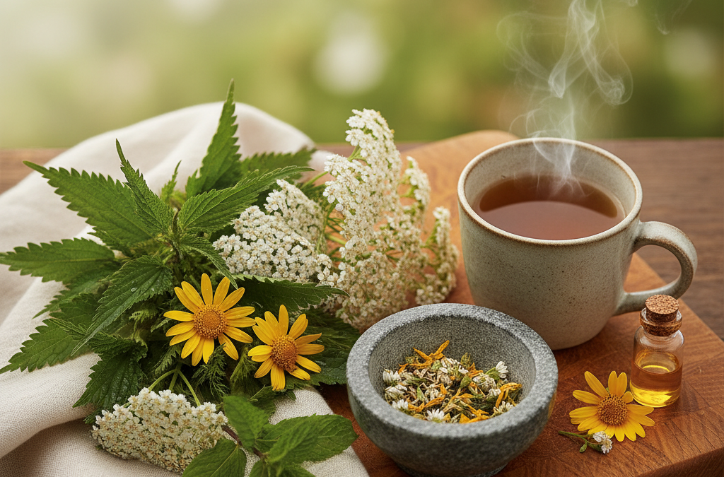 - Krwawnik pospolity i arnika górska łagodzą stany zapalne, idealne na opuchliznę po urazach.