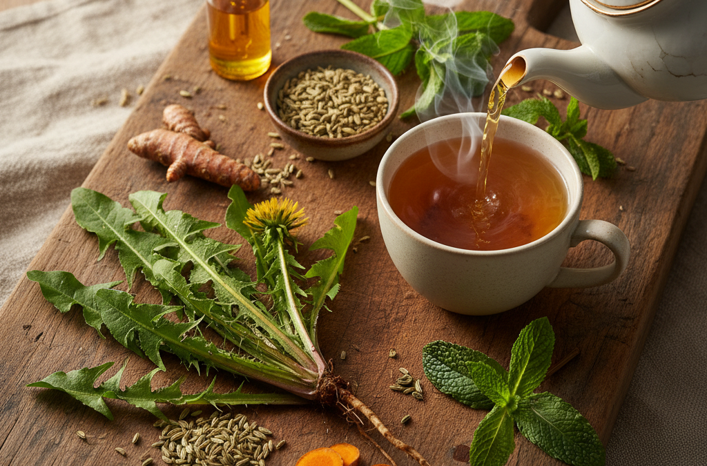 - Zioła takie jak ostropest plamisty, kurkuma i mięta pieprzowa wspomagają pracę woreczka żółciowego i wątroby, poprawiając wydzielanie żółci i łagodząc stany zapalne.