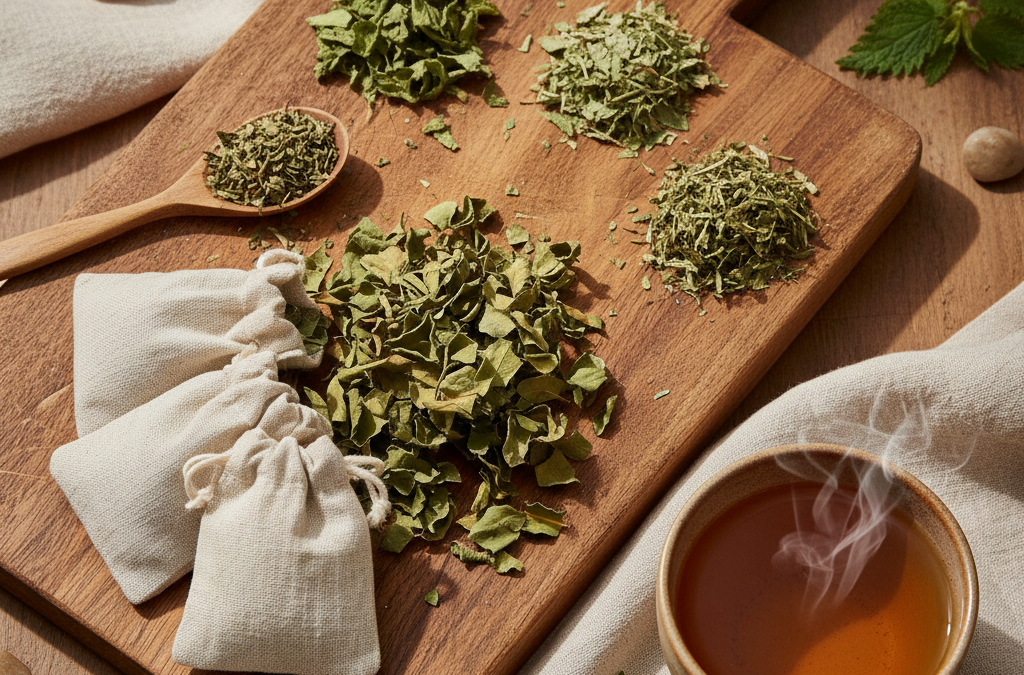 1. Przygotuj składniki: czystek, wybrane zioła (np. miętę, szałwię, melisę lub pokrzywę).