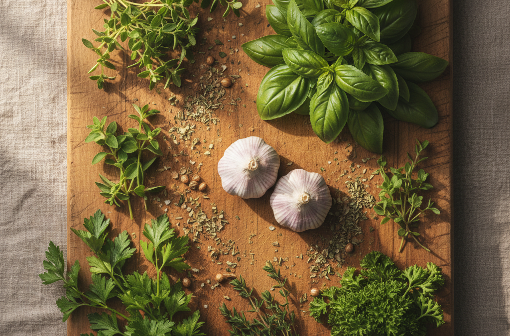 Czosnek, chociaż nie jest ziołem w tradycyjnym rozumieniu, ma intensywny smak. Jest doskonałym dodatkiem do wielu potraw. Można stosować go świeżego lub w postaci sproszkowanej.