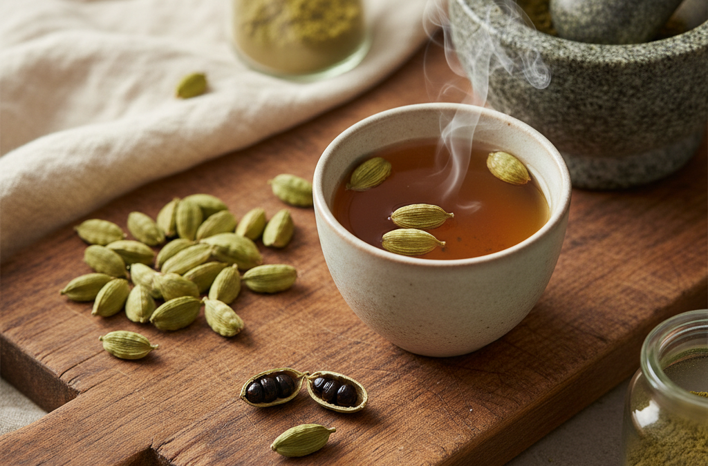- Herbata z kardamonem: Zalej wrzątkiem zmielone nasiona z imbirem i miodem dla orzeźwiającego napoju.