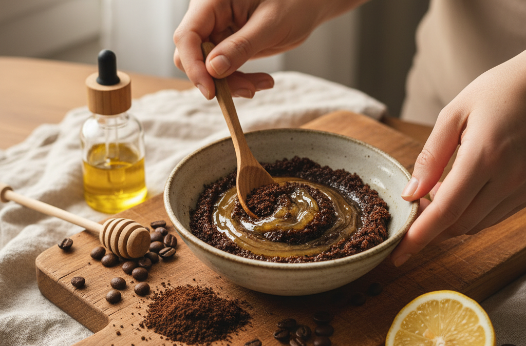 - Peeling nawilżający: 2 łyżki zmielonej kawy, 1 łyżka miodu i 1 łyżka oleju kokosowego.