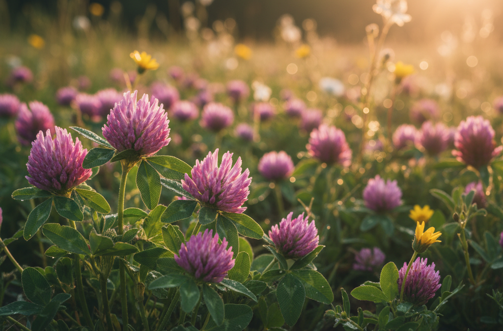 - Koniczyna łąkowa (Trifolium pratense) bogata w izoflawony działa jak naturalny fitoestrogen, łagodząc objawy menopauzy i wspierając zdrowie serca.