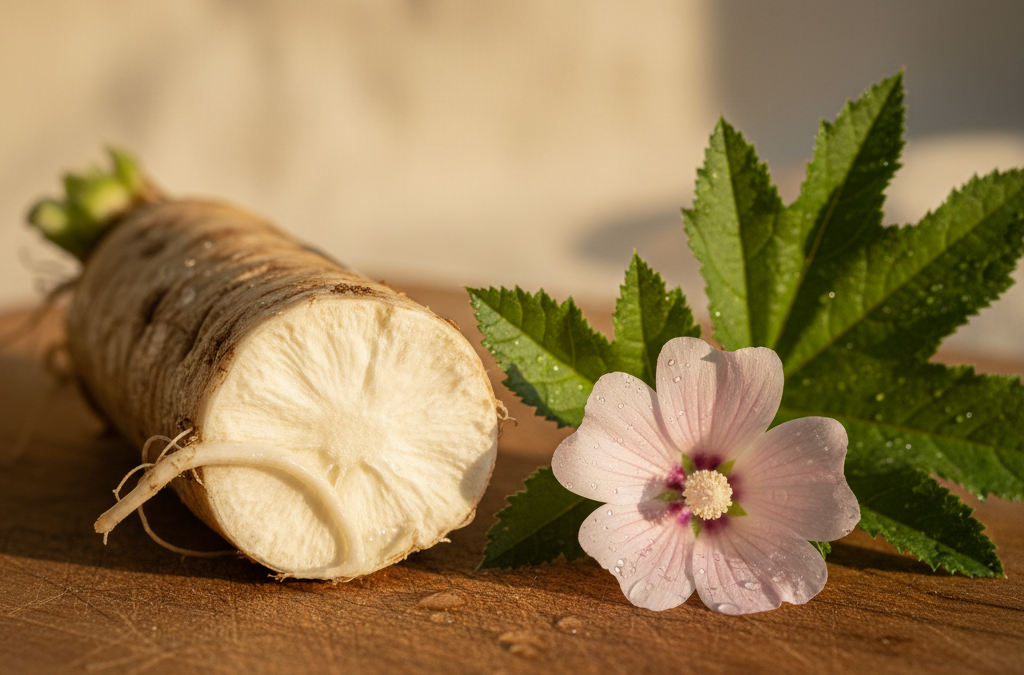 Prawoślaz lekarski (Althaea officinalis) to bylina uprawiana w Polsce, ceniona w ziołolecznictwie, kuchni i cukiernictwie. Historycznie stosowano go na bóle żołądka, biegunki, czerwonkę, choroby płuc, kamicę nerkową czy cholerę. Dziś korzeń prawoślazu działanie czyni go kluczowym surowcem śluzowym w preparatach na błony śluzowe. Zawiera polisacharydy, pektyny, flawonoidy i fenole, które tworzą ochronny film na śluzówkach.