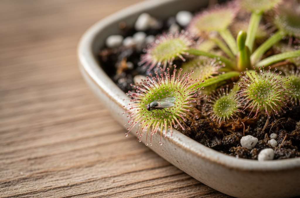 Jesienią liście czerwienieją, roślina wchodzi w spoczynek – ogranicz wodę, przenieś do chłodnego (5-10°C) jasnego miejsca. Problemy: czarne liście (zbyt twarda woda), brak rosy (niska wilgotność), szkodniki (mszyce – spłucz wodą z mydłem potasowym). LSI: pułapka na owady, enzymy trawienne, torfowiska, bagna, rośliny owadożerne, sundew care.