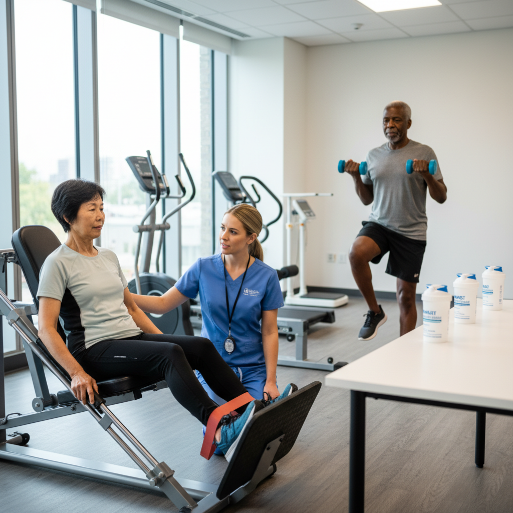 Wszystkie wyniki wskazywały na korzystniejszy trend w grupie z ćwiczeniami i suplementami białkowymi, choć różnice nie były statystycznie istotne. Na przykład SPPB poprawiło się o średnio 0,93 punktu (95% CI: -2,70 do 4,56), a 6MWT o 41,92 m (95% CI: -39,05 do 122,89).