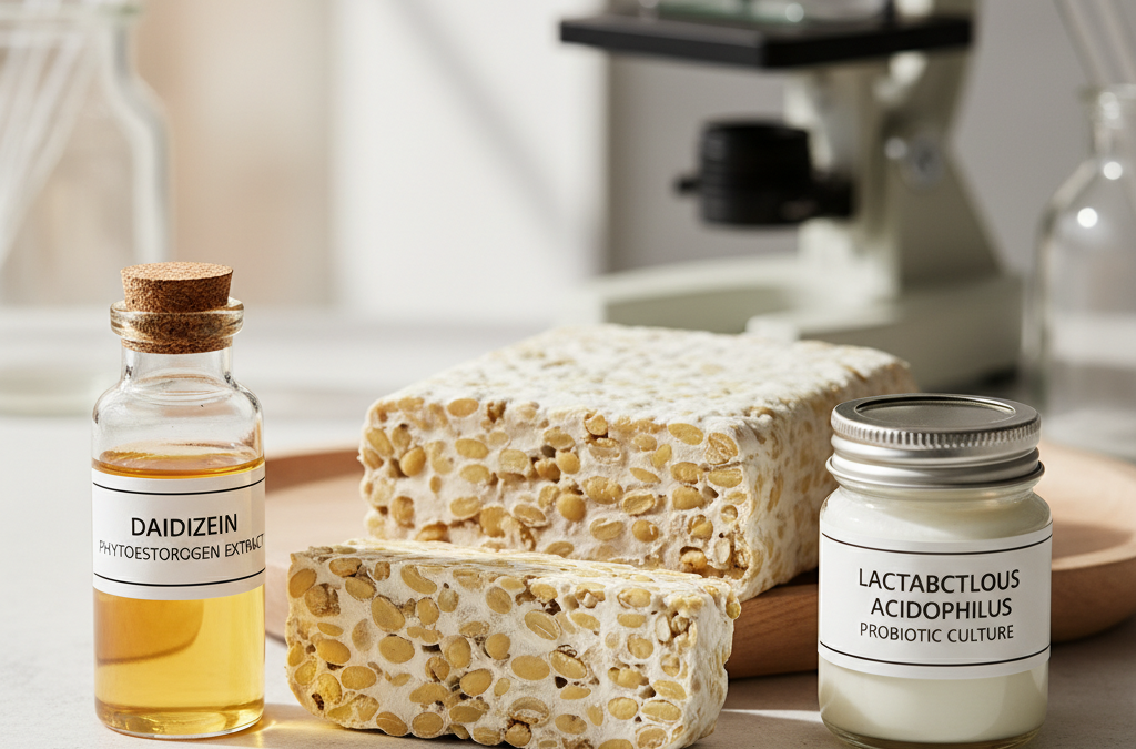 - Daidzeina, tempeh i probiotyk Lactobacillus acidophilus zwiększają odkładanie fosforu w kościach (udzie), nerkach i trzustce u szczurów po menopauzie.