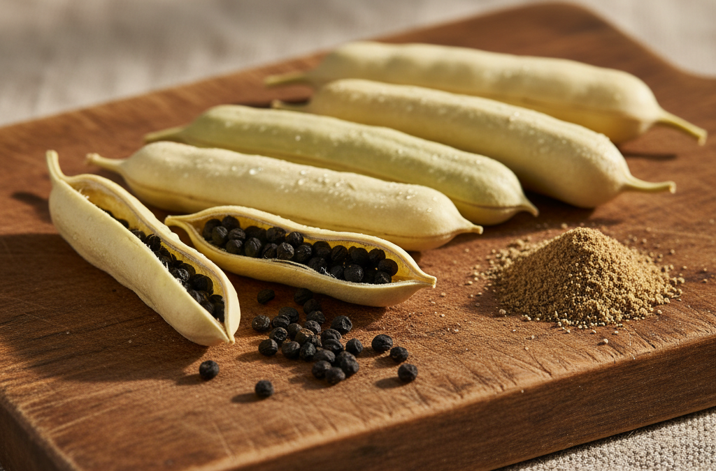 Roślina ta może osiągnąć do 2 metrów wysokości, a jej owoce są dojrzałe po około 10 miesiącach. Owoce mają kolor od białego do żółtego i osiągają długość od 1 do 2 cali. Owoce suszy się i mieli się w celu uzyskania cukrowo-pieprzowego proszku, który jest powszechnie stosowany jako przyprawa.